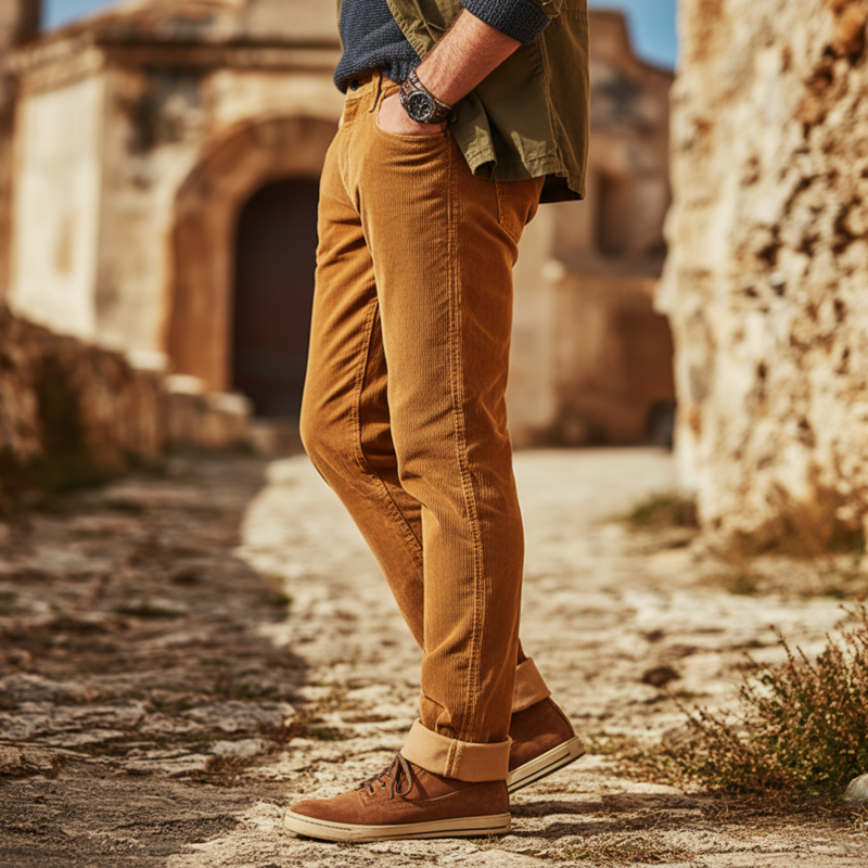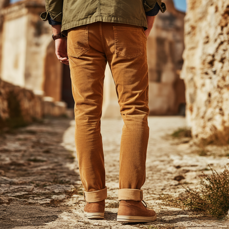 Moderne, minimalistiske slim fit kordfløyelsbukser til herre i karamellfarge